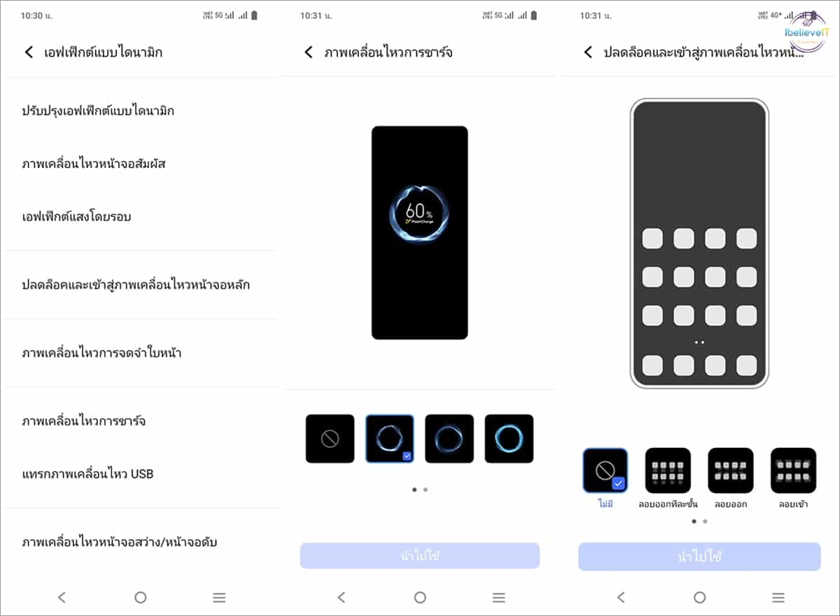 Dynamic Effects จะช่วยเสริมการใช้งานสมาร์ตโฟนของเราให้ดูน่าตื่นตาตื่นใจยิ่งขึ้น โดยผู้ใช้งานสามารถเลือกเอฟเฟกต์สำหรับการตั้งค่าปลดล็อกและเข้าสู่ภาพเคลื่อนไหวหน้าจอหลัก, ภาพเคลื่อนไหวการจดจำใบหน้า และภาพเคลื่อนไหวการชาร์จ