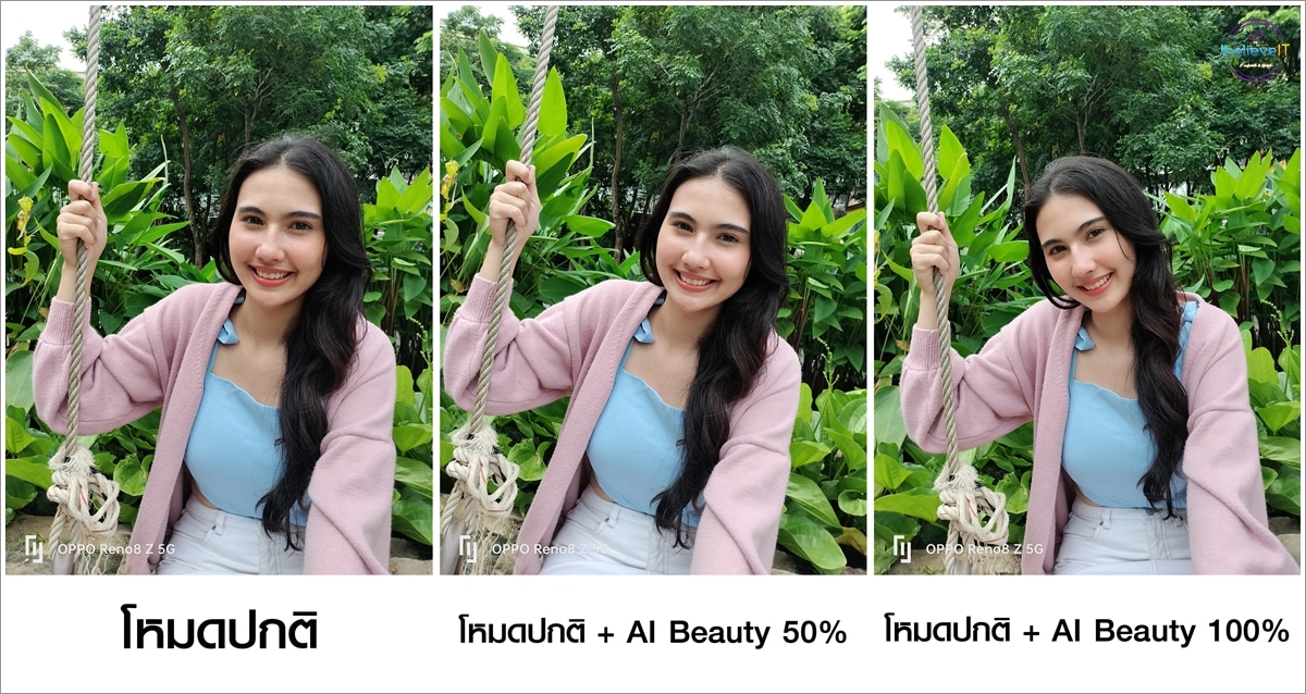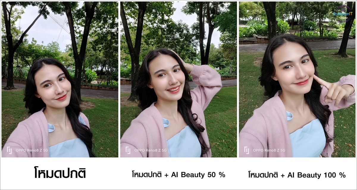 ภาพแรกถ่ายด้วยโหมดรูปถ่ายปกติ ภาพที่สองถ่ายด้วยโหมดรูปถ่ายปกติ พร้อมตั้งค่าเลือก AI Beauty 50% และภาพที่สามถ่ายด้วยโหมดรูปถ่ายปกติ พร้อมตั้งค่าเลือก AI Beauty 100%