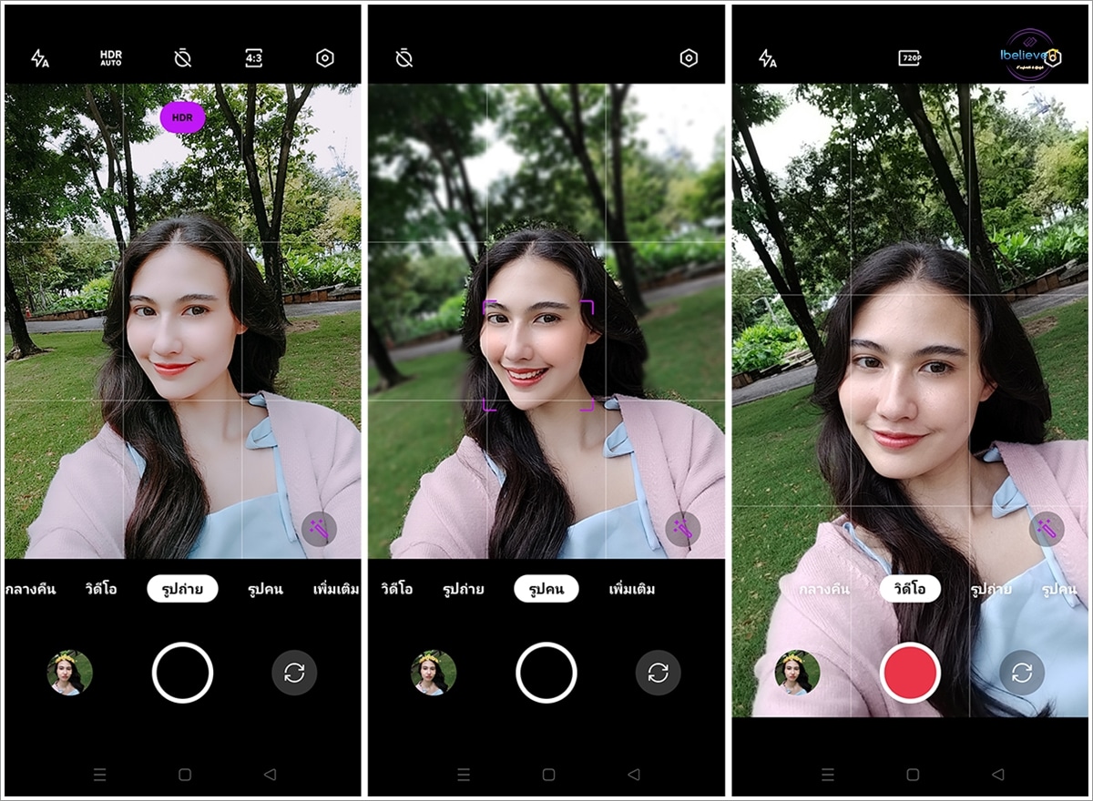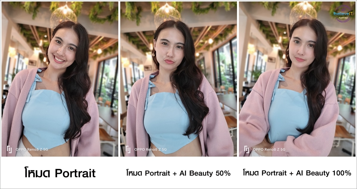 ภาพแรกถ่ายด้วยโหมดรูปคน (Portrait) และเปิดโบเก้ 60% ภาพที่สองถ่ายด้วยโหมดรูปคน พร้อมตั้งค่าเลือก AI Beauty 50% และเปิดโบเก้ 60% และภาพที่สามถ่ายด้วยโหมดรูปคน พร้อมตั้งค่าเลือก AI Beauty 100% และเปิดโบเก้ 60%
