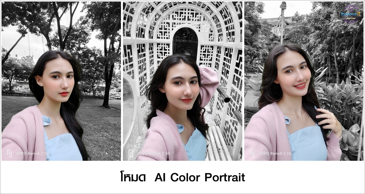 ภาพถ่ายด้วยโหมด Portrait เลือกฟิลเตอร์ AI Color Portrait ที่ช่วยเปลี่ยนฉากหลังให้เป็นขาว-ดำ แต่ยังคงภาพสีให้กับตัวบุคคล ทำให้ได้ภาพ Portrait ที่โดดเด่นสะดุดตาอีกรูปแบบ