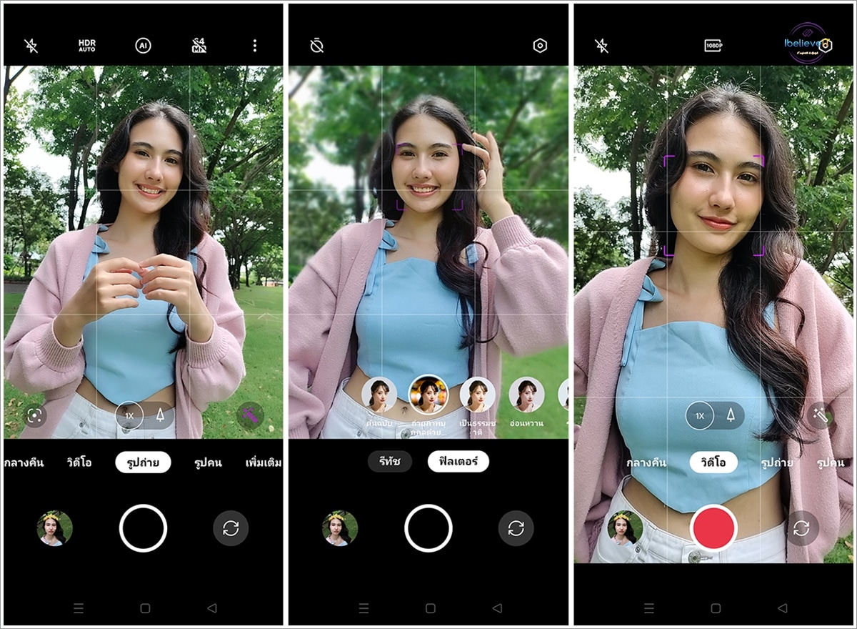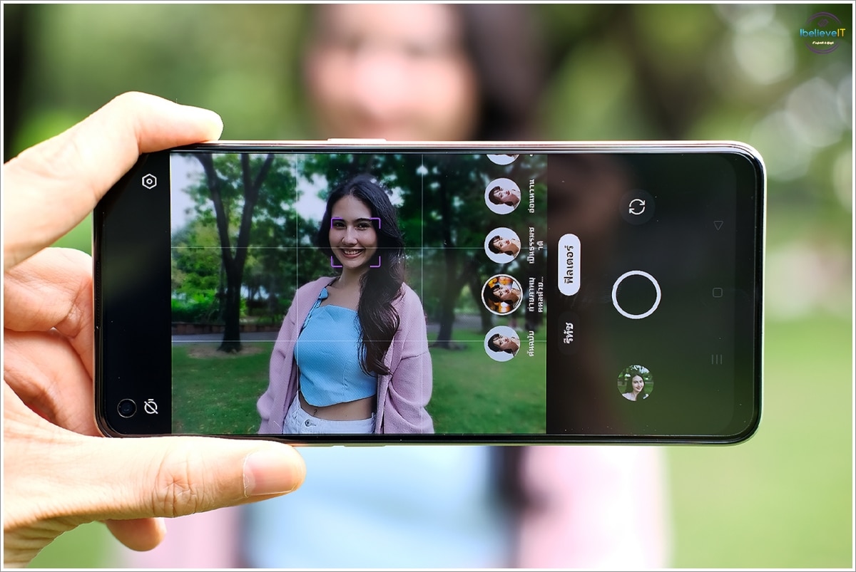 ภาพถ่ายด้วยโหมดรูปถ่ายปกติ พร้อมตั้งค่าเลือก AI Beauty 60% และเลือกฟิลเตอร์ที่มีให้เลือกถึง 10 แบบ