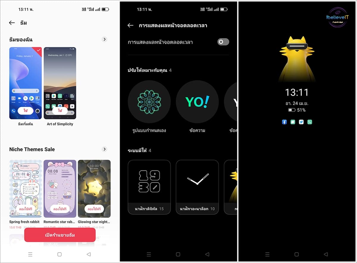 ใน realme UI 3.0 รองรับการปรับแต่งธีมสีแบบสากล เพื่อให้ผู้ใช้เลือกโทนสีที่โดนใจได้ตามใจ รวมถึงการอัปเกรด AOD ( Always-On Display) เพื่อให้ผู้ใช้นำภาพโปรดมาทำเป็นภาพหน้าจอได้อย่างง่ายดาย หรือเลือก AOD ดีไซน์ realmeow (เรียวเหมียว) มัสคอตสุดน่ารักของแบรนด์ ให้คุณแสดงตัวตนที่โดดเด่นได้ไม่เหมือนใครอีกด้วย
