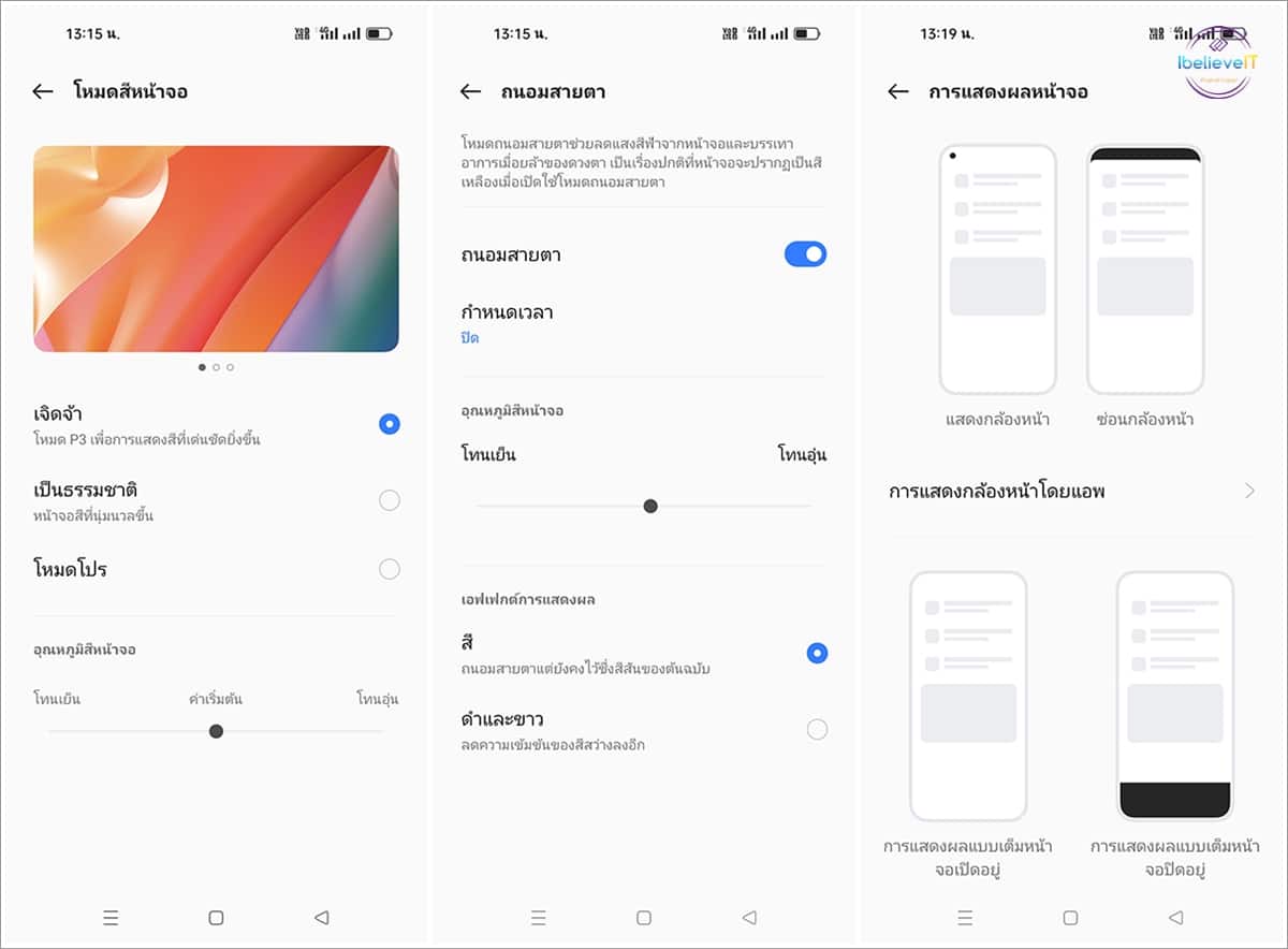 พร้อมโหมดสีหน้าจอที่เลือกปรับได้ทั้งเจิดจ้า เป็นธรรมชาติ และโหมดโปรที่เลือกได้ทั้งภาพยนตร์ และสดใส รวมถึงมีโหมดถนอมสายตา และปรับอุณหภูมิสีหน้าจอได้ โดยการเพิ่มอุณหภูมิสีเพื่อลดรังสีแสงสีฟ้า เพื่อป้องกันอาการปวดตา และสามารถตั้งเวลา เปิด-ปิด อัตโนมัติ และเลือกการแสดงผลหน้าจอเพื่อซ่อนกล้องหน้า และสแดงผบแบบเต็มหน้าจอได้